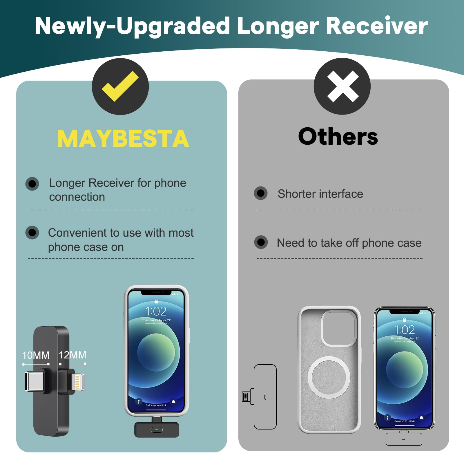 • Longer Receiver: The interface of the receiver for the mini microphone has been upgraded to be longer for phone connection. Compared with other wireless microphones, this one has the advantage of using together with most of the phone cases. In other words, for youtube or tiktok influencers or online celebrities on other social media platforms, they don’t have to take off the phone case before making audio or video recordings, which is a very user-friendly design that allows people to do vlogging, livesteaming filming or online teaching, video conference while your phone can be protected
