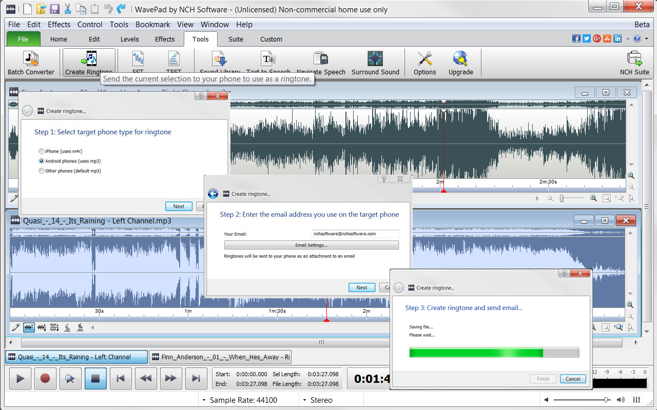 Importing and Exporting with Ease Export into one of many file formats, including: .wav, .mp3, .wma, .ogg, .m4a, .raw, .flac and many more. Create your own customized ringtone from your music. Import music from or burn directly to CD. Connect seamlessly through WavePad to NCH MixPad to mix your edited music and record your own tracks, midis, and beats, or launch NCH Switch to convert your music file formats.